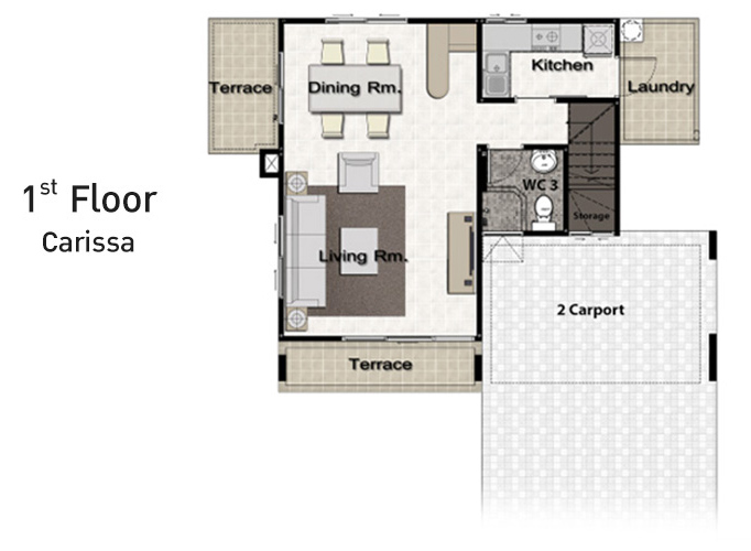 4. Carissa - บ้านเดี่ยว 2 ชั้น พื้นที่ใช้สอย 130 ตร.ม. 3 ห้องนอน, 3 ห้องน้ำ, 1 ห้องนั่งเล่น, 1 ส่วนรับประทานอาหาร, 1 ห้องครัว พร้อมที่จอดรถในร่ม 2 คัน