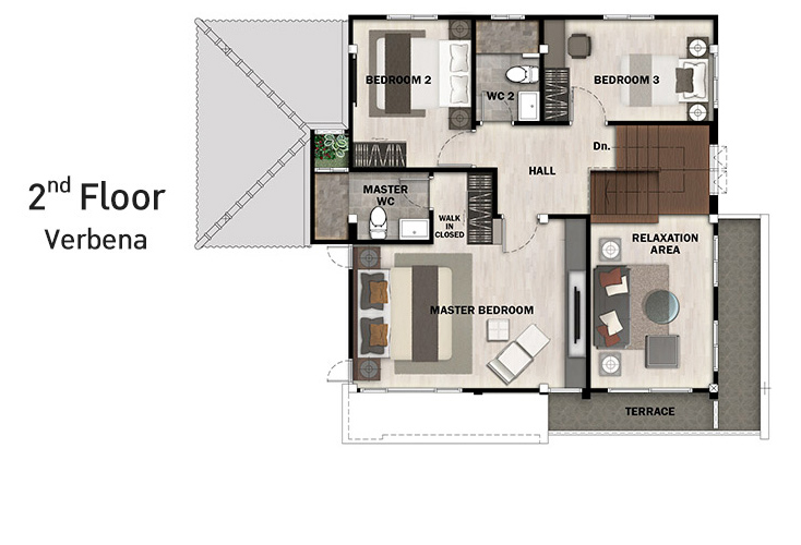 2. Verbena - บ้านเดี่ยว 2 ชั้น พื้นที่ใช้สอย 175 ตร.ม. 4 ห้องนอน, 3 ห้องน้ำ, 2 ห้องนั่งเล่น, 1 ส่วนรับประทานอาหาร, 1 ห้องครัว พร้อมที่จอดรถในร่ม 2 คัน