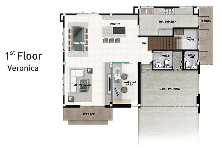 1. Veronica - บ้านเดี่ยว 2 ชั้น พื้นที่ใช้สอย 204 ตร.ม. 3 ห้องนอน, 4 ห้องน้ำ, 2 ห้องนั่งเล่น, 1 ส่วนรับประทานอาหาร, 1 ห้องครัว, พร้อมที่จอดรถในร่ม 2 คัน