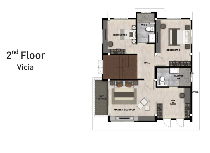 3. Vicia - บ้านเดี่ยว 2 ชั้น พื้นที่ใช้สอย 147 ตร.ม. 4 ห้องนอน, 3 ห้องน้ำ, 1 ห้องนั่งเล่น, 1 ส่วนรับประทานอาหาร, 1 ห้องครัว พร้อมที่จอดรถในร่ม 2 คัน