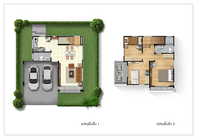 2. POEM - บ้านเดี่ยว 2 ชั้น เนื้อที่เริ่มต้น 50 ตร.ว. พื้นที่ใช้สอย 133 ตร.ม. 3 ห้องนอน 2 ห้องน้ำ พื้นที่รับแขกเชื่อมต่อกับส่วนรับประทานอาหาร ครัว ที่จอดรถในร่ม 2 คัน