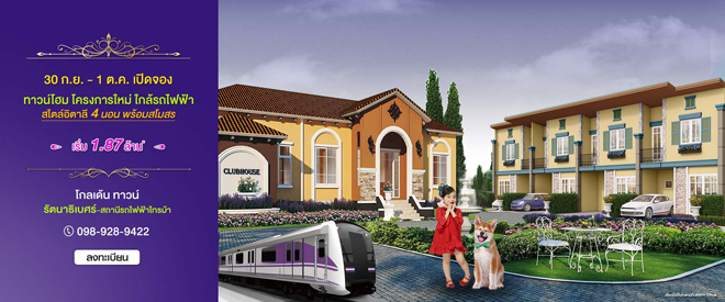 โกลเด้น ทาวน์ รัตนาธิเบศร์ - สถานีรถไฟฟ้าไทรม้า (Golden Town Rattanathibet - Saima Station) เตรียมพบกับทาวน์โฮมโครงการใหม่ ใกล้รถไฟฟ้า 30 ก.ย. - 1 ต.ค. นี้ เปิดให้จอง ทาวน์โฮมโครงการใหม่ ใกล้รถไฟฟ้า สไตล์อิตาลี่ ขนาด 4 ห้องนอน พร้อมสโมสรครบครัน ในราคาเริ่ม 1.87 ล้าน* สำหรับท่านที่สนใจทาวน์โฮมใกล้รถไฟฟ้าสายสีม่วง สถานีไทรม้า สามารถลงทะเบียนเพื่อรับส่วนลดเพิ่ม 10,000 บาท ได้ที่เว็บไซต์ของโกลเด้นแลนด์ค่ะ