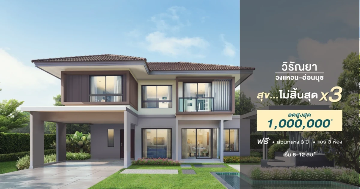 บริษัท เรียลแอสเสท ดีเวลลอปเม้นท์ จำกัด ส่งโปรโมชั่นพิเศษ สุข...ไม่มีสิ้นสุด x 3 กับโครงการ วิรัณยา วงแหวน - อ่อนนุช (Viranya Wongwaen - Onnut) บ้านเดี่ยว 2 ชั้น ทำเลอ่อนนุช - วงแหวน