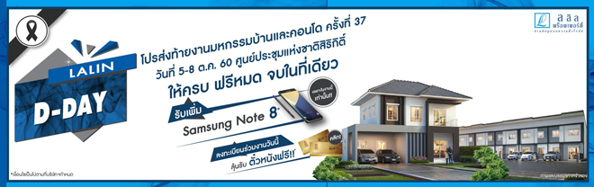ทั้งนี้บริษัทจัดแคมเปญพิเศษ "Lalin D-Day โปรส่งท้ายให้ครบ ฟรีหมด จบที่เดียว" พร้อมรับเพิ่ม Samsung Galaxy Note 8 (จำนวนจำกัด) มอบความคุ้มค่าให้กับลูกค้าที่จองเฉพาะในงานมหกรรมบ้านและคอนโด ครั้งที่ 37 รวมถึงจัดเตรียมกิจกรรมร่วมสนุกตลอดงานอีกมากมายที่บูธ