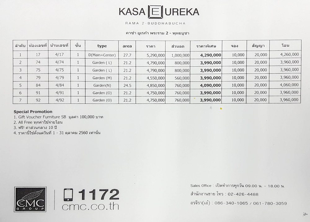 CMC GROUP ได้แก่ บริษัทเจ้าพระยามหานคร จำกัด (มหาชน) และบริษัท พระยาพาณิชย์พร็อพเพอร์ตี้ จำกัด ได้นำบ้านยูนิตพิเศษ 7 ยูนิต จากโครงการ คาซ่า ยูเรก้า พระราม 2-พุทธบูชา ทาวน์เฮ้าส์ 3 ชั้น สไตล์ European Colonial มาจัดโปรราคาพิเศษ รีบหน่อยนะคะ มีเพียงแค่ 7 ยูนิตเท่านั้น