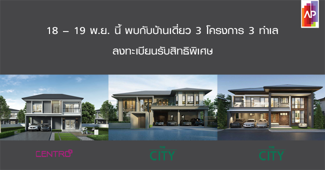 บริษัท เอพี (ไทยแลนด์) จำกัด (มหาชน) เปิดตัวบ้านโครงการใหม่ 3 โครงการ 3 ทำเลศักยภาพ ได้แก่ "เซนโทร พหลฯ - วิภาวดี", "เดอะ ซิตี้ ปิ่นเกล้า - บรมฯ", "เดอะ ซิตี้ สาทร - สุขสวัสดิ์" พบกัน 18 - 19 พฤศจิกายน 2560 นี้ โดยเปิดให้ลงทะเบียนรับสิทธิพิเศษก่อนใคร