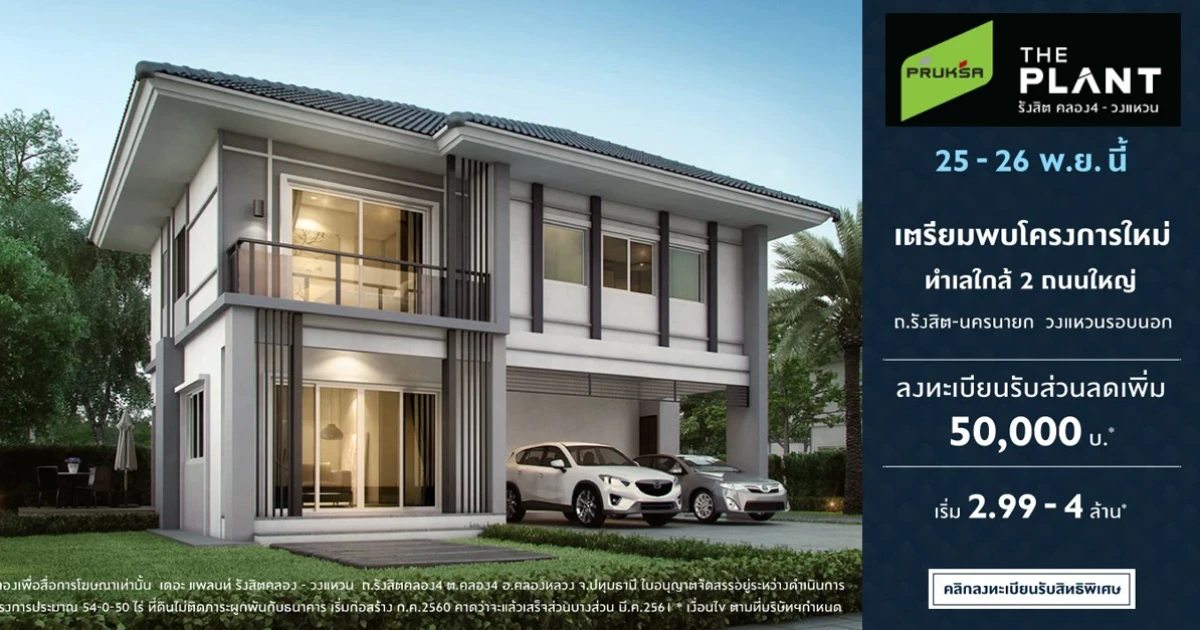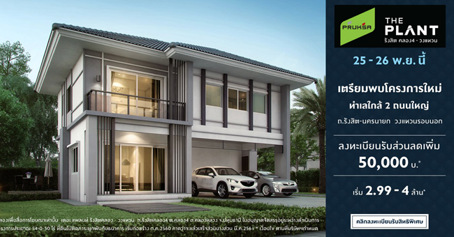 บริษัท พฤกษา เรียลเอสเตท จำกัด (มหาชน) เปิดตัวบ้านเดี่ยวโครงการใหม่ "เดอะ แพลนท์ รังสิต คลอง 4 - วงแหวน (The Plant Rangsit Klong 4 - Wongwaen)" บ้านแนวคิดใหม่ บนทำเลศักยภาพใกล้ถนนใหญ่ 2 ทาง คือ ถนนรังสิตนครนายก และถนนวงแหวนรอบนอก (ตะวันออก) พบกัน 25 - 26 พฤศจิกายน 2560 นี้ ลงทะเบียนรับส่วนลดเพิ่ม 50,000 บาท*