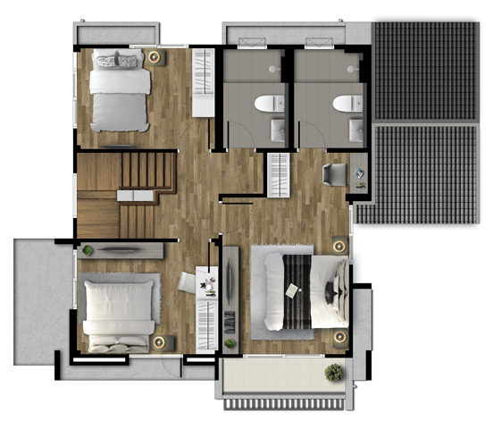 2. แบบบ้าน STARRY - บ้านเดี่ยว 2 ชั้น พื้นที่ใช้สอย 175 ตร.ม. เนื้อที่ดินเริ่มต้น 50 ตร.วา ขนาด 4 ห้องนอน 3 ห้องน้ำ 1 ห้องนั่งเล่น ที่จอดรถ 2 คัน