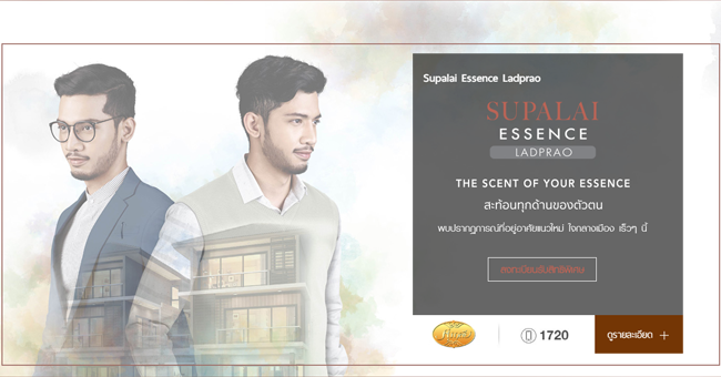 บริษัท ศุภาลัย จำกัด (มหาชน) เปิดประสบการณ์ของที่อยู่อาศัยแนวใหม่ ใจกลางเมือง "ศุภาลัย เอสเซ้นส์ ลาดพร้าว (Supalai Essence Ladprao)" ผู้ที่สนใจเข้าลงทะเบียนรับสิทธิพิเศษก่อนใครได้ที่ลิงก์ด้านล่างนี้ และติดตามรับข่าวสารโครงการได้ก่อนใครที่เช็คราคาดอทคอม เร็วๆ นี้
