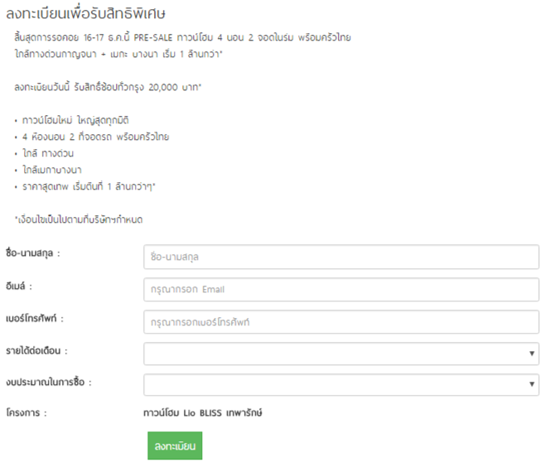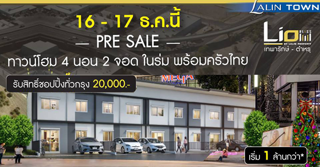 เตรียมพบกับโครงการ ลลิล ทาวน์ ไลโอ บลิสซ์ เทพารักษ์-ตำหรุ โดยบริษัท ลลิล พร็อพเพอร์ตี้ จำกัด (มหาชน) (LALIN) ปรากฏการณ์ใหม่ของการอยู่อาศัยบนทำเลเทพารักษ์ ด้วยฟังก์ชั่น 4 ห้องนอน 2 ที่จอดรถในร่ม พร้อมครัวไทย ใกล้ทางด่วน เมกาบางนา ราคาเริ่ม 1 ล้านกว่าบาทเท่านั้น และเร็วๆ นี้ สำหรับผู้ที่สนใจสามารถลงทะเบียนในเว็บไซต์ เพื่อรับสิทธิ์ช้อปปิ้งทั่วกรุง 20,000 บาท จองแปลงสวยทำเลหน้าโครงการ โซนติดสวนก่อนใคร