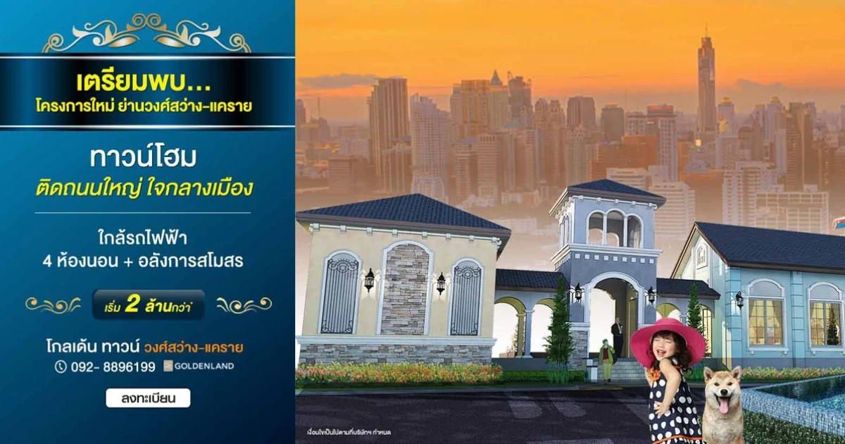 โกลเด้นแลนด์ เปิดให้จองแล้ว โกลเด้น ทาวน์ วงศ์สว่าง-แคราย (Golden Town Wongsawang - Khae Rai) ปังที่สุดในย่านนี้!! เตรียมพบ โครงการใหม่ ย่านวงศ์สว่าง-แคราย ที่สุดทาวน์โฮม ติดถนนใหญ่ ใจกลางเมือง ใกล้รถไฟฟ้า กับทาวน์โฮม 4 ห้องนอน 3 ห้องน้ำ สไตล์อังกฤษ อลังการสโมสร+โรงหนังส่วนตัว ท่านที่สนใจสามารถลงทะเบียนเพื่อรับส่วนลดเพิ่ม 10,000 บาท* ได้ที่เว็บไซต์ของโกลเด้นแลนด์ค่ะ