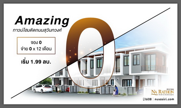 โปรโมชั่น: ณ ราธร สุวินทวงศ์ ทาวน์โฮมขนาดกระทัดรัดเพื่อการเริ่มต้นชีวิตอีกระดับ จอง 0 จ่าย 0 x 12 เดือน Amazing 0 โปรแรงรับปี 2018 อยู่ฟรี 12 เดือน -ฟรี ค่าใช่จ่ายวันโอน -ฟรี แอร์ 2 เครื่อง ราคาเพียง 1.99 ล้านบาท
