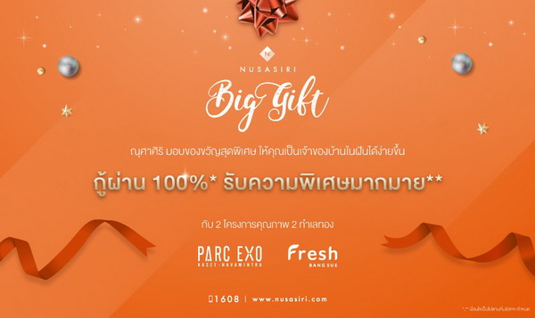 โปรโมชั่น: Nusasiri Big Gift กู้ผ่าน 100%* เพิ่มโอกาสเป็นเจ้าของ 2 โครงการเด่น Fresh Condominium และ Parc EXO วันนี้ - 31 มกราคม 2561 ณุศาศิริ มอบของขวัญยิ่งใหญ่ส่งท้ายปี สานฝันคนอยากมีบ้านให้กลายเป็นจริง กับแคมเปญ "Nusasiri Big Gift กู้ผ่าน 100%*" เพิ่มโอกาสให้คุณได้เป็นเจ้าของ 2 โครงการเด่นจากณุศาศิริ การันตีกู้ผ่าน 100%* !!