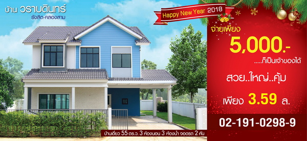 โปรโมชั่น: บ้านวราบดินทร์ รังสิต - คลองสาม บ้านเดี่ยว 55 ตร.ว. 3 ห้องนอน 3 ห้องน้ำ จ่ายเพียง 5,000 บาท ก็เป็นเจ้าของได้ ราคาเริ่มต้น 3.59 ล้านบาท