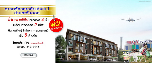 โปรโมชั่น: โกลเด้น บิส บางนา-กิ่งแก้ว Home office (โฮมออฟฟิศ) โอกาสทอง...ของคนอยากรวย!! เปิดตัวอาณาจักรการค้าแห่งใหม่ ย่านตะวันออก ติดถนนใหญ่ ใกล้เมกะบางนา+สุวรรณภูมิ โฮมออฟฟิศ หน้ากว้าง 4 ชั้น พร้อมที่จอดรถถึง 2 เท่า! คุ้มค่า เกินราคา ฟรี! ทุกค่าใช้จ่าย* เริ่ม 5 ล้านต้น