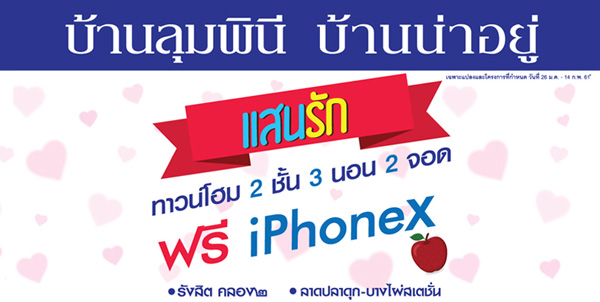 โปรโมชั่น: Big Bonus 12 - 18 กุมภาพันธ์ 2561 นี้ 7 วัน กับข้อเสนอพิเศษ จองในงานลุ้นรับ iPhone X* เริ่ม 3.99 - 25 ล้านบาท