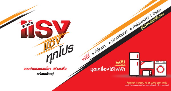 โปรโมชั่น: รวมทุกโปรดาวเด่น ที่คนซื้อบ้าน คอนโด ทาวน์เฮาส์อยากได้ ฟรีเยอะ... ลดหนัก... ผ่อนเบา ลุ้นรับสูงสุด 1 ล้าน* ทุกเดือน แจกหนักถึง 3 ต่อ 84 รางวัล รวมมูลค่ากว่า 17 ล้าน* ไม่อยากให้พลาด! วันนี้ - 31 มี.ค. 2561 เท่านั้น