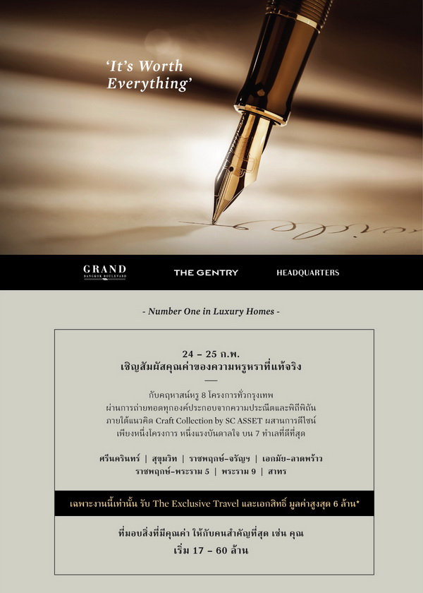 โปรโมชั่น: 24 - 25 กุมภาพันธ์ 2561 เชิญสัมผัสคุณค่าของความหรูหราที่แท้จริง กับคฤหาสน์หรู 8 โครงการทั่วกรุงเทพ ผ่านการถ่ายทอดทุกองค์ประกอบจากความประณีตและพิถีพิถัน ภายใต้แนวคิด Craft Collection by SC ASSET ผสานการดีไซน์เพียงหนึ่งโครงการ หนึ่งแรงบันดาลใจ บน 7 ทำเลที่ดีทีสุด เฉพาะงานนี้เท่านั้น รับ The Exclusive Travel และเอกสิทธิ์ มูลค่าสูงสุด 6 ล้านบาท*