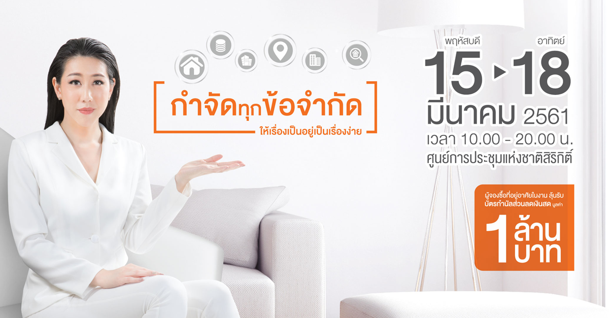 กลับมาอีกครั้งกับงาน มหกรรมบ้านและคอนโด ครั้งที่ 38 "กำจัดทุกข้อจำกัด...ให้เรื่องเป็นอยู่เป็นเรื่องง่าย" เป็นมหกรรมที่รวบรวมบ้านและคอนโดพร้อมโปรโมชั่นพิเศษจากบริษัทพัฒนาอสังหาริมทรัพย์ทั้งรายใหญ่และรายเล็กมาให้เลือกในงานเดียว มีกิจกรรมให้ร่วมสนุกหลายกิจกรรมลุ้นรับตุ๊กตาหมี และ iPhoneX พิเศษ! สำหรับผู้จองและผู้ซื้อในงาน ลุ้นรับบัตรกำนัลเงินสด มูลค่า 1 ล้านบาท* โดยจัดงานขึ้นตั้งแต่วันพฤหัสบดีที่ 15 - วันอาทิตย์ที่ 18 มีนาคม นี้ เวลาตั้งแต่ 10.00 - 20.00 น. ณ ศูนย์การประชุมแห่งชาติสิริกิติ์ ติดตามโปรโมชั่นบ้านและคอนโดในมหกรรมบ้านและคอนโด ครั้งที่ 38 ได้ที่ Checkraka.com เร็วๆ นี้
