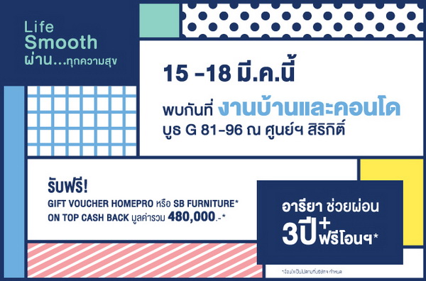 โปรโมชั่น: 15 - 18 มีนาคม 2561 นี้ พบกับอารียาที่ งานบ้านและคอนโด บูธ G 81-96 ณ ศูนย์ฯ สิริกิติ์ รับฟรี! Gift Voucher Homepro หรือ SB Furniture* ON TOP CASH BACK มูลค่ารวม 480,000 บาท*