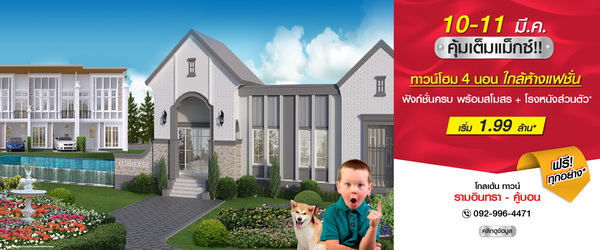 โปรโมชั่น: "โกลเด้น ทาวน์ รามอินทรา-คู้บอน" 10-11 มี.ค. คุ้มเต็มแม็กซ์!! ฟรี...ทุกอย่าง*! ทาวน์โฮม พร้อมอยู่ 4 ห้องนอน 3 ห้องน้ำ สไตล์อังกฤษ อลังการสโมสร+โรงหนังส่วนตัว เดินทางสะดวก ใกล้รถไฟฟ้า+ห้างแฟชั่น และทางด่วน เริ่ม 1.99 ล้าน*
