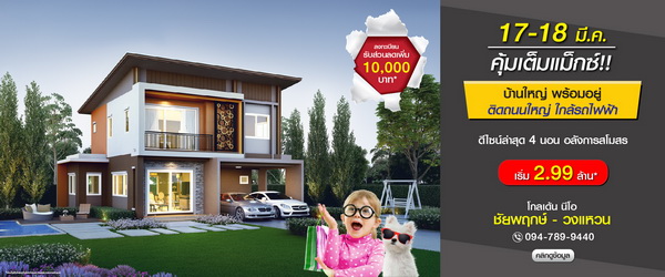 โปรโมชั่น: "โกลเด้น นีโอ ชัยพฤกษ์-วงแหวน" ห้ามพลาด!! 17-18 มี.ค. นี้ คุ้มจัดเต็ม ลงทะเบียนรับเพิ่ม 10,000 บาท* โทรจองเยี่ยมชมโครงการ โทร. 094-789-9440 พบบ้านใหญ่ พร้อมอยู่ สไตล์โมเดิร์นเรโทร 4 ห้องนอน 2 ที่จอดรถ อลังการสโมสร เดินทางสะดวก ติดถนนใหญ่ ใกล้รถไฟฟ้า เริ่ม 2.99 ล้าน*