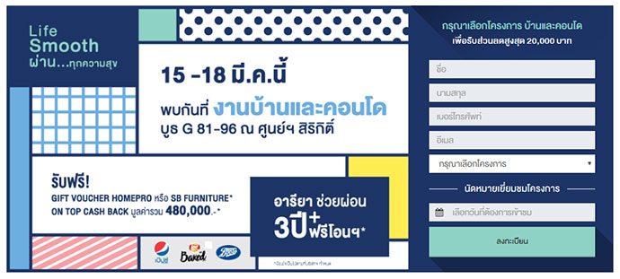 พร้อมข้อเสนอสุดพิเศษ ช่วยผ่อน 3 ปี* พร้อม ฟรีโอนฯ ทุกรายการ* และยังรับฟรี! Gift voucher Homepro หรือ SB Furniture* On top cash back 10,000 บาท จำนวน 48 รางวัล* มูลค่ารวม กว่า 480,000 บาท* เอกสิทธิ์พิเศษสำหรับลูกค้าที่จองในงานและโอนภายใน 31 มี.ค. 2561 เท่านั้น