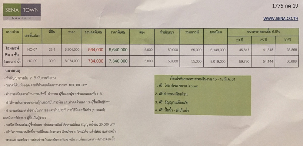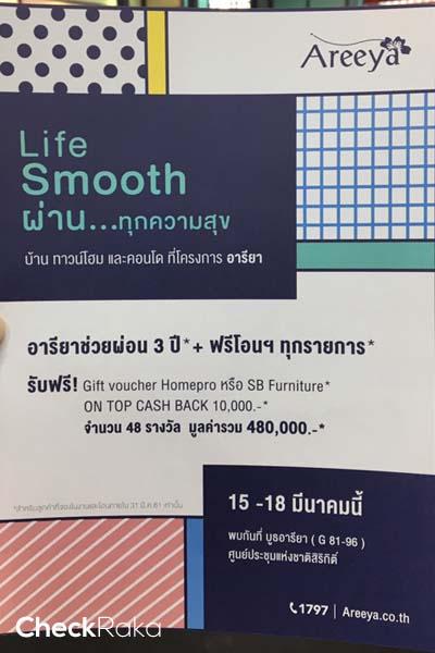 พร้อมข้อเสนอสุดพิเศษ ช่วยผ่อน 3 ปี* พร้อม ฟรีโอนฯ ทุกรายการ* และยังรับฟรี! Gift voucher Homepro หรือ SB Furniture* On top cash back 10,000 บาท จำนวน 48 รางวัล* มูลค่ารวม กว่า 480,000 บาท* เอกสิทธิ์พิเศษสำหรับลูกค้าที่จองในงานและโอนภายใน 31 มี.ค. 2561 เท่านั้น