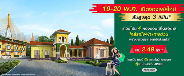 โปรโมชั่น: โกลเด้น ทาวน์ ๓ สุขสวัสดิ์-พุทธบูชา 19 - 20 พฤษภาคม 2561 นี้ กระแสแรง เปิดจองเฟสใหม่! รับคืนสูงสุด 3 แสน*!! ทาวน์โฮม โครงการใหม่ ย่านสุขสวัสดิ์ ใกล้รถไฟฟ้า+ทางด่วน 4 ห้องนอน 3 ห้องน้ำ สไตล์อังกฤษ พร้อมสโมสร+โรงหนังส่วนตัว ที่สุดทำเลใกล้รถไฟฟ้า+เซ็นทรัล เริ่ม 2.49 ล้าน*