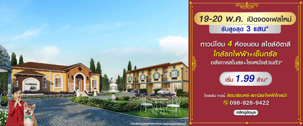 โปรโมชั่น: โกลเด้น ทาวน์ รัตนาธิเบศร์-สถานีรถไฟฟ้าไทรม้า รีบเลย! 19 - 20 พฤษภาคม 2561 นี้ เปิดจองเฟสใหม่ รับคืนสูงสุด 3 แสน*!! ทาวน์โฮม โครงการใหม่ สไตล์อังกฤษ ที่สุดทำเลใกล้รถไฟฟ้า+เซ็นทรัล มาพร้อม 4 ห้องนอน 3 ห้องน้ำ อลังการสโมสร+โรงหนังส่วนตัว เริ่ม 1.99 ล้าน*