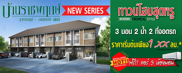 โปรโมชั่น: บ้านราชพฤกษ์ สุวรรณภูมิ-ลาดกระบัง เฟส 5 New Series!! ทาวน์โฮมสุดหรู 3 นอน 3 น้ำ 2 จอดรถ พร้อมคลับเฮ้าท์และสระว่ายน้ำ ราคาเพียง 1.xx ลบ. ฟรี!! แอร์ 3 ห้องนอน