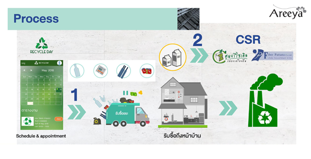 นอกจากนี้อารียาฯ ยังได้ร่วมมือกับพันธมิตร Application Recycle Day พัฒนานวัตกรรมแอปพลิเคชัน ช่วยจัดการขยะอย่างมืออาชีพ เพื่อตอบโจทย์สังคมยุคใหม่ มีระบบการแจ้งเตือน ตลอดจนการใช้งานที่สะดวกสบาย อีกทั้งยังมีการจัดการขยะในรูปแบบรีไซเคิล โดยร่วมมือกับ บริษัท ไฟเบอร์พัฒน์ จำกัด เพื่อสร้างคุณประโยชน์จากขยะ ต่อยอดเป็นสิ่งของรีไซเคิลส่งต่อให้กับชุมชน ตลอดจนสถานศึกษาที่ต้องการต่อไป