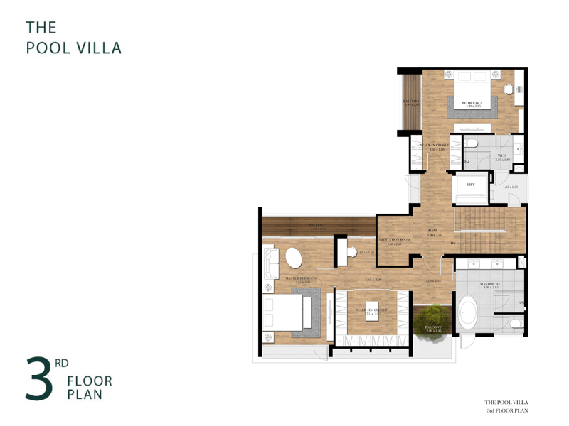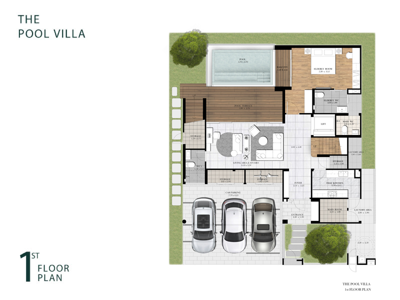 3. The Pool Villa - พื้นที่ใช้สอยประมาณ 490 ตร.ม. ที่ดินเริ่มต้น 70 ตร.ว. 4 ห้องนอน 6 ห้องน้ำ 3 ที่จอดรถ 1 ห้องอเนกประสงค์ ห้องพักผ่อน / ลานอเนกประสงค์ / ห้องรับแขก / ห้องพระ / ครัวไทย / ส่วนเตรียมอาหาร / ห้องรับประทานอาหาร / ห้องแม่บ้าน/ลิฟท์ / สระว่ายน้ำส่วนตัว