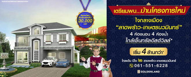 เตรียมพบ บ้านเดี่ยว โครงการใหม่! จาก โกลเด้นแลนด์ โกลเด้น นีโอ ๒ ลาดพร้าว-เกษตรนวมินทร์ (Golden Neo ๒ Ladprao - Kaset nawamin) โครงการใหม่ ทำเลใจกลางเมือง ลาดพร้าว - เกษตรนวมินทร์ พบกับบ้านหลังใหญ่ ขนาด 4 ห้องนอน 4 ห้องน้ำ 2 ที่จอดรถ พร้อมสโมสร ท่านที่สนใจสามารถลงทะเบียนรับส่วนลดเพิ่ม 30,000 บาท* ได้ที่เว็บไซต์ของโกลเด้นแลนด์