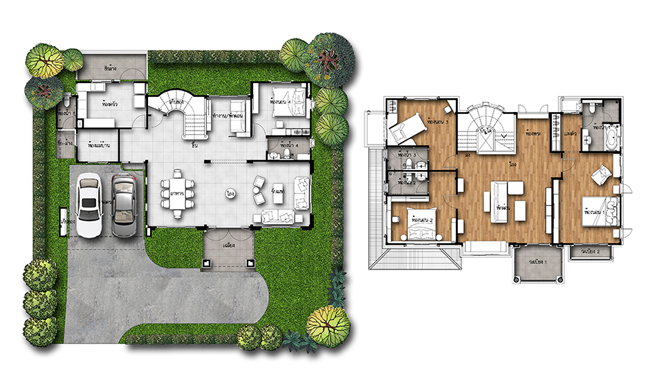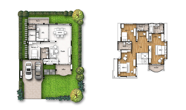 1. แบบบ้านศุภราช - บ้านเดี่ยว 2 ชั้น พื้นที่ใช้สอย 318 ตร.ม. สร้างบนที่ดินตั้งแต่ 100 ตร.ว.ขึ้นไป ขนาด 4 ห้องนอน 5 ห้องน้ำ 1 ห้องทำงาน 1 ห้องพักผ่อน 1 ห้องคนรับใช้ พร้อมที่จอดรถ 2 คัน