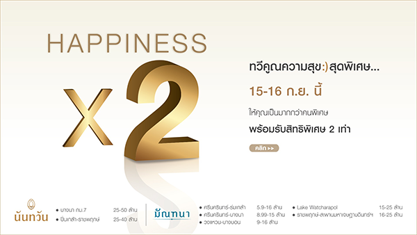 โปรโมชั่น: บ้านคุณภาพ คัดพิเศษ นันทวัน-มัณฑนา Happiness X 2 ทวีคูณความสุข :) สุดพิเศษ... 15 - 16 กันยายน นี้ ให้คุณเป็นมากกว่าคนพิเศษ พร้อมรับสิทธิพิเศษ 2 เท่า