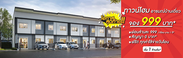โปรโมชั่น: ทาวน์โฮมอารมณ์บ้านเดี่ยว จอง 999 บาท* ผ่อนล้านละ 999/เดือน นาน 1 ปี สัญญา 0 บาท* ฟรี! ทุกค่าใช้จ่ายวันโอน เริ่ม 1 ล้านต้น*