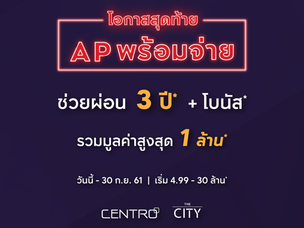 โปรโมชั่น: โอกาสสุดท้าย AP พร้อมจ่าย ช่วยผ่อน 3 ปี* + โบนัส รวมมูลค่าสูงสุด 1 ล้าน* วันนี้ - 30 กันยายน 2561 เริ่ม 4.99 - 30 ล้านบาท