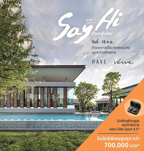 โปรโมชั่น: Say Hi บ้านหลังใหม่ วันนี้ - 15 กันยายน 2561 บ้านและทาวน์โฮมของคนรุ่นใหม่ บน 9 ทำเลศักยภาพ Pave / Verve รับเพิ่มหูฟังบลูทูธออกกำลังกาย Jabra Elite Sport 4.5* รับสิทธิพิเศษสูงสุดกว่า 700,000 บาท*