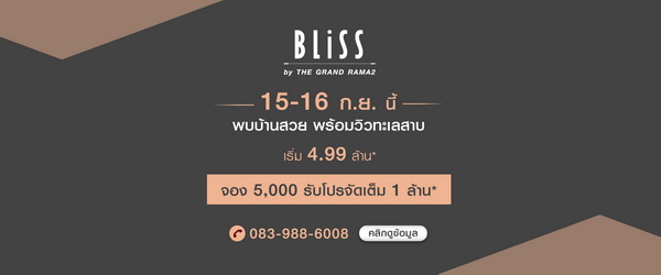 โปรโมชั่น: "BLISS BY THE GRAND RAMA 2" พบบ้านสวย วิวทะเลสาบ ย่านพระราม 2 สะดวกทุกการเดินทาง ติดถนนใหญ่ ใกล้ 2 เซ็นทรัล พิเศษ! จอง 5,000 รับโปรฯ จัดเต็ม 1 ล้าน*!! 15 - 16 กันยายน 2561 นี้ เริ่ม 4.99 ล้าน*