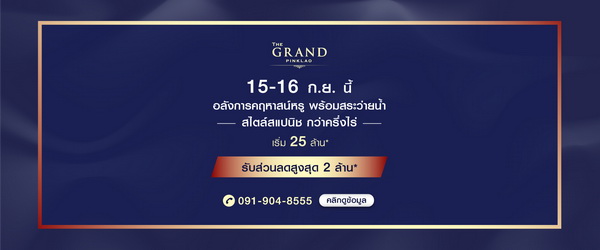 โปรโมชั่น: เดอะ แกรนด์ ปิ่นเกล้า 15-16 กันยายน 2561 พบคฤหาสน์หรู โครงการ เดอะ แกรนด์ ปิ่นเกล้า ดีไซน์สไตล์สแปนิชสุดอลังการ! พร้อมสระว่ายน้ำ บนที่ดินกว่าครึ่งไร่ เปิดโซนใหม่ หน้าสวนสวยขนาดใหญ่ ราคาเริ่มต้น 25 ล้าน*