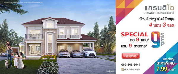โปรโมชั่น: แกรนดิโอ ลาดพร้าว-เกษตรนวมินทร์ Special 9 "มหัศจรรย์หมายเลข 9" ตลอดเดือนกันยายนนี้ รับโปรโมชั่นที่ดีที่สุดแห่งปี ครั้งเดียว! จำนวนจำกัด! ไม่มีอีกแล้ว! **ลด 9 แสน แถม 9 รายการ** บ้านเดี่ยว สไตล์อังกฤษ ฟังก์ชันดีที่สุดบนทำเลนี้ 4 ห้องนอน 3 ที่จอดรถ พร้อม Double living room + Laundry room และห้องพระ เปิดจองแบบบ้านรุ่นใหญ่ Lambert ราคาพิเศษ 7.99 ล้าน* ล็อตสุดท้าย พร้อมชมความอลังการของคลับเฮ้าส์และบรรยากาศสไตล์บริติช