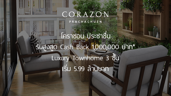 โปรโมชั่น: โคราซอน ประชาชื่น รับสูงสุด Cash Back 1,000,000 บาท* Luxury Townhome 3 ชั้น เริ่ม 5.99 ล้านบาท