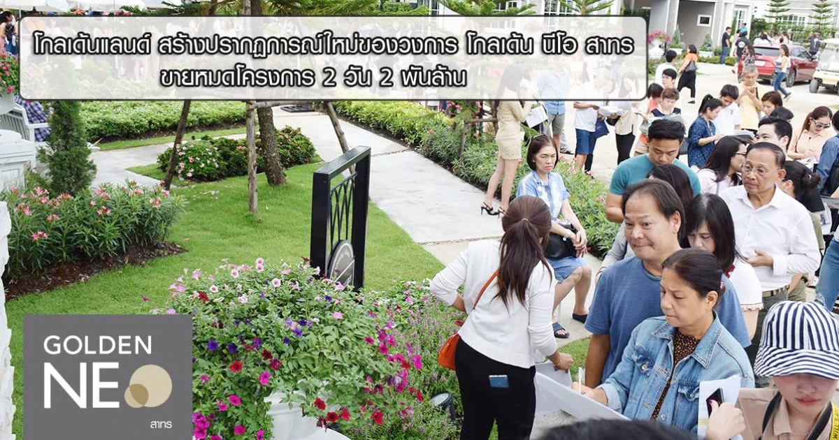 โกลเด้น นีโอ สาทร (Golden Neo Sathorn) กวาดยอดขายหมดโครงการ อีกครั้ง 237 หลัง กว่า 2,100 ล้านบาท ใน 2 วันแรกที่เปิดจอง ทำลายสถิติยอดขายวันเปิดจองสูงสุดสำหรับโครงการแนวราบของวงการอสังหาริมทรัพย์ โครงการ โกลเด้น นีโอ สาทร (Golden Neo Sathorn) มาพร้อมกับแบบบ้านแนวคิดใหม่ที่เรียกว่า นีโอ โฮม บ้านที่ไม่ได้จำกัดว่าเป็นบ้านเดี่ยวหรือบ้านแฝด แต่เป็นบ้านที่มีฟังก์ชันเพื่อการอยู่อาศัยครบ อาทิ ห้องรับแขก ห้องรับประทานอาหาร ที่จอดรถ ห้องครัว ห้องนอน และยังมีฟังก์ชันพิเศษเพิ่มให้มากกว่า ห้องพระ, ห้องนอนชั้นล่าง, ห้องซัก ตาก รีด หรือ GOLDEN Laundry Glass House, ห้องพักผ่อนชั้นบน เป็นต้น เนื้อที่โครงการประมาณ 43 ไร่ จำนวน 237 หลัง มูลค่า 2,000 ล้านบาท พบ นีโอ โฮม 3 แบบใหม่ ราคา เริ่มที่ 6.49 ล้านบาท