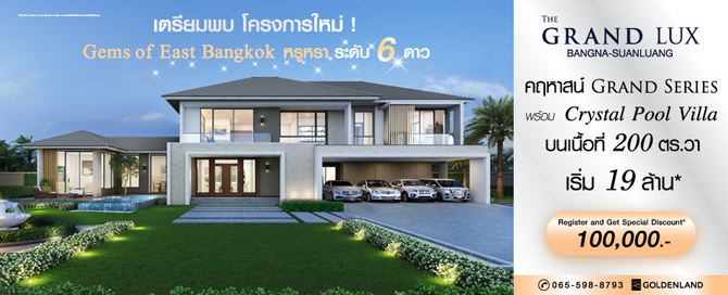 เดอะ แกรนด์ ลักซ์ บางนา-สวนหลวง (The Grand Lux Bangna-Suanluang) จาก โกลเด้นแลนด์ เตรียมพบ โครงการใหม่ ที่บางนา Gems of East Bangkok หรูหรา ระดับ 6 ดาว คฤหาสน์ GRAND SERIES พร้อม Crystal Pool Villa สวยงาม เลอค่า กับ ดีไซน์บ้านเดี่ยวพร้อมสระสปาส่วนตัว ประดับด้วยทองแท้ บนเนื้อที่ 200 ตร.ว. *ท่านที่สนใจสามารถลงทะเบียนเพื่อรับข้อมูลก่อนใคร พร้อม Special Discount 100,000 บาท* ได้ที่เว็บไซต์ของโกลเด้นแลนด์