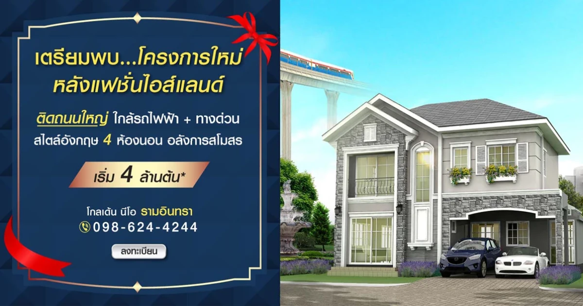 บ้านโครงการใหม่! จาก โกลเด้นแลนด์ โกลเด้น นีโอ รามอินทรา - วงแหวน (Golden Neo Ramintra - Wongwaen) เตรียมพบ บ้านโครงการใหม่ หลังแฟชั่นไอส์แลนด์ ทำเลดีที่สุดย่านรามอินทรา!! ติดถนนใหญ่ ใกล้รถไฟฟ้า+ทางด่วน พบกับบ้านรุ่นใหม่ สไตล์อังกฤษ 4 ห้องนอน อลังการสโมสร พร้อมสวนธรรมชาติรอบโครงการ *ท่านที่สนใจสามารถลงทะเบียนรับส่วนลดเพิ่ม 30,000 บาท* ได้ที่เว็บไซต์ของโกลเด้นแลนด์