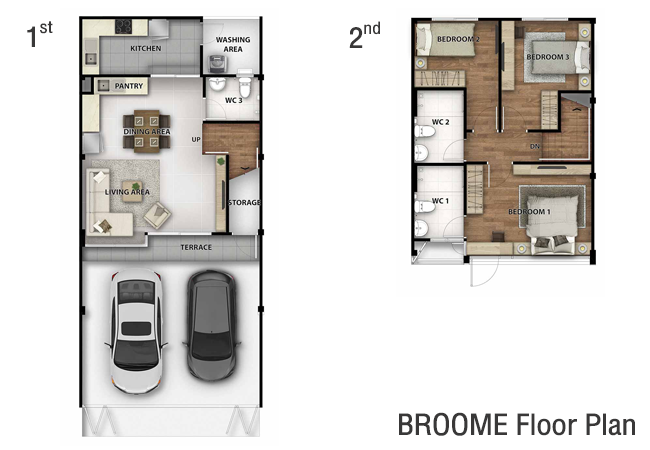 1. แบบบ้าน BROOME พื้นที่ใช้สอย 134 ตร.ม. หน้ากว้าง 6.25 เมตร ประกอบไปด้วย 3 ห้องนอน, 3 ห้องน้ำ, Living Area, Dining Area, Kitchen, 2 ที่จอดรถ