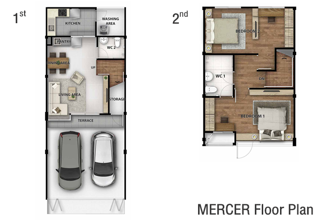2. แบบบ้าน MERCER พื้นที่ใช้สอย 117 ตร.ม. หน้ากว้าง 5.5 เมตร ประกอบไปด้วย 2 ห้องนอน 2 ห้องน้ำ, Living Area, Dining Area, Kitchen, 2 ที่จอดรถ