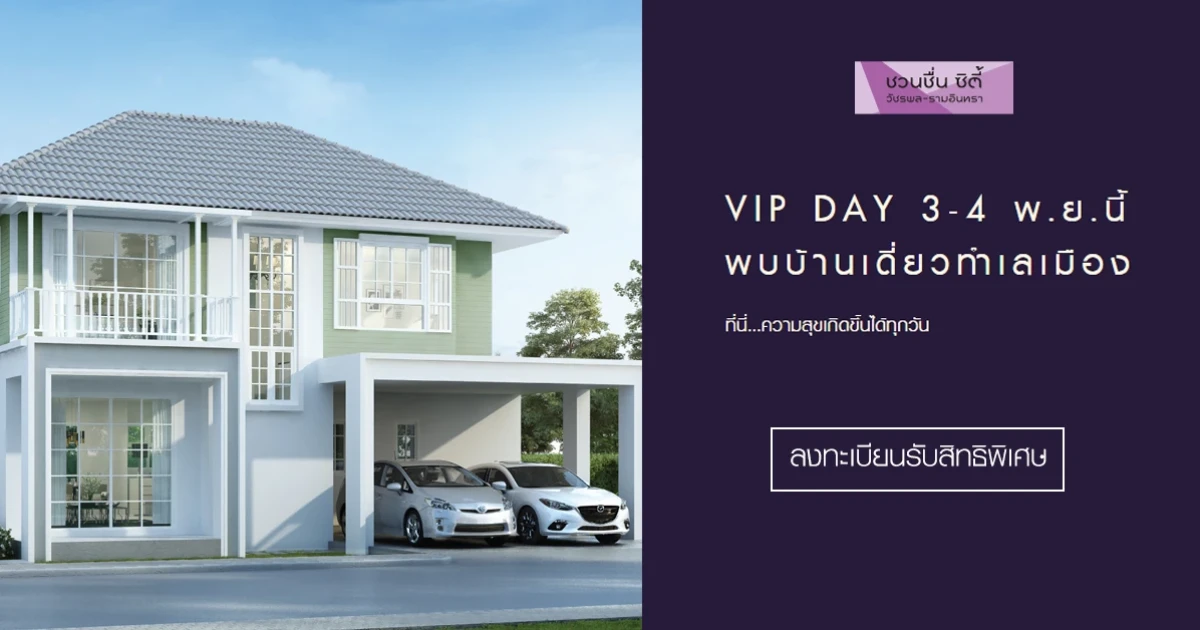 บริษัท มั่นคงเคหะการ จำกัด (มหาชน) เตรียมเปิดตัวบ้านโครงการใหม่ "ชวนชื่น ซิตี้ วัชรพล - รามอินทรา (Chuan Chuen City Watcharapol - Ramintra)" บ้านเดี่ยวทำเลเมือง เพียง 10 นาที ถึงรถไฟฟ้าสายสีชมพู ใกล้ทางด่วนและห้างสรรพสินค้า เปิด VIP DAY วันที่ 3 - 4 พฤศจิกายน 2561 นี้ ลงทะเบียน รับข้อเสนอพิเศษฟรีทุกค่าใช้จ่ายวันโอน ส่วนลด 200,000 บาท*