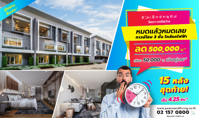 บริษัท พีซแอนด์ลีฟวิ่ง จำกัด จัดโปรโมชั่นโครงการ "ดิ เอ็กซ์คลูซีฟ รัชดา - วงศ์สว่าง (The Exclusive Ratchada - Wongsawang)" ด่วน! ก่อนปรับเกณฑ์กู้ หมดแล้ว หมดเลย!!! ลดสูงสุด 500,000 บาท* จ่ายเพียง 50,000 บาท* เข้าอยู่ได้เลย!! 15 หลังสุดท้าย!